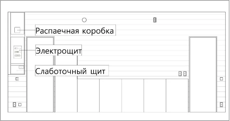 За дверцей электрического щита расположены ниша для основной электрики (220-380 Вт) и отдельная ниша для слаботочной системы (интернет, телефония, видеонаблюдение). Также отдельно сделаны закладные для ввода основного электричества в дом и для ввода слаботочных систем.