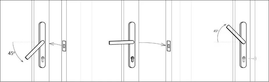 - для закрывания двери на замок необходимо закрыть дверь и потянуть ручку вверх. Тем самым полотно двери притянется по всему периметру к дверной коробке. Такое положение двери является оптимальным для сохранения геометрии дверного полотна и долгой эксплуатации.