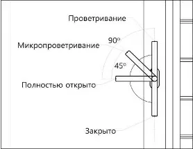 - полностью закрыто с притяжкой окна к коробу (ручка вертикально вниз),