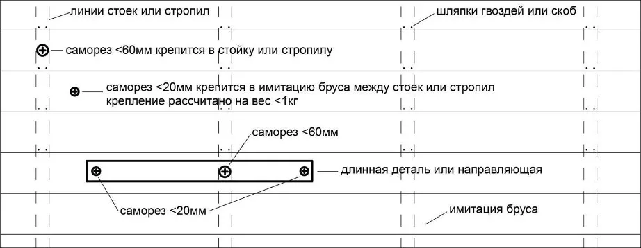 Тяжелые и крупные мебельные элементы или предметы интерьера крепятся только к стойкам каркаса или стропилам длинными саморезами, но не глубже 60 мм. Если вам нужно закрепить большую деталь, или направляющую, то обязательно зафиксировать ее длинным (глубина до 60 мм) саморезом в стойки каркаса, и короткими саморезами (глубина до 20 мм) в имитацию бруса между стоек. Линии стоек и стропил можно определить по расположению крепежных элементов отделки – гвоздям или скобам в разных модификациях. Стойки и стропила имеют ширину 45 мм. Стойки стоят вертикально. Стропила расположены перпендикулярно имитации бруса.