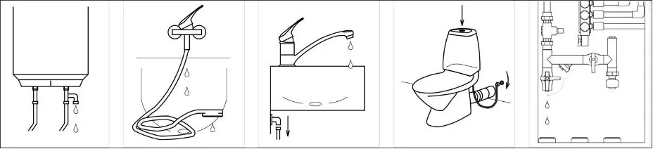 Не допускается замерзание воды в системе водоснабжения. В случае риска падения температуры внутри дома ниже 0°С обязательно нужно слить всю воду из системы водоснабжения, коллекторной группы, смесителей, гибкой подводки, бойлера, смывного бачка и из унитаза.